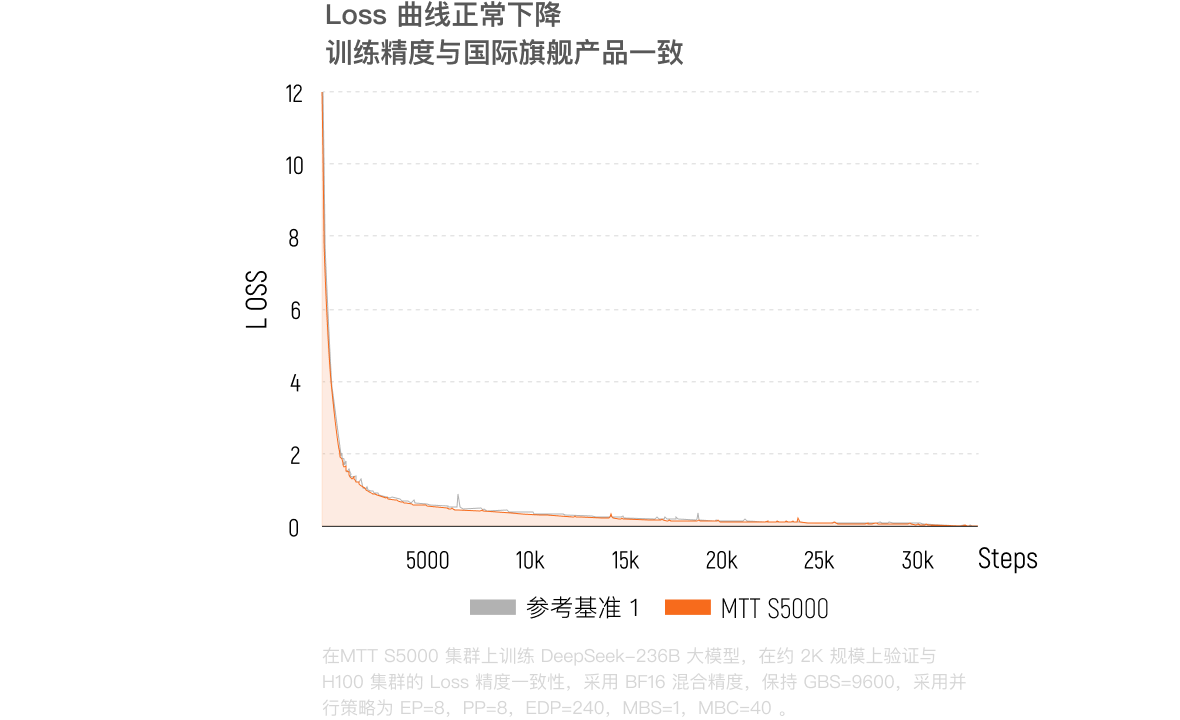 2026年1月,智源研究院基于MTT S5000千卡集群,完成了前沿具身大脑模型RoboBrain 2.5(数千亿参数)的端到端训练与对齐验证,MTT S5000表现出了与H100集群极高的结果一致性,练损失值(loss)差异仅为0.62%,整体训练效果甚至实现小幅超越。