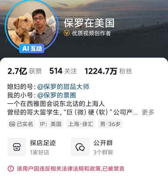 目前,“保罗在美国”被平台正式禁言,账号主页显示“该用户因违反相关法律法规和政策,已被禁言”。