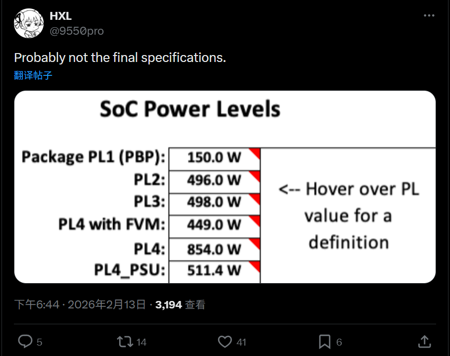 还是爆料大户HXL的消息,他给出了Nova Lake处理器更详细的PL功耗状态,虽然还不一定是最终结果,但可以参考下。