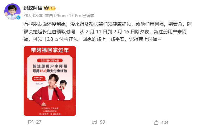 蚂蚁阿福表示,考虑到部分用户尚未回家,未能帮长辈领取健康红包,决定将活动时间延长至2月16日除夕夜,2月11日至2月16日期间,新注册用户均可领取16.8元红包。