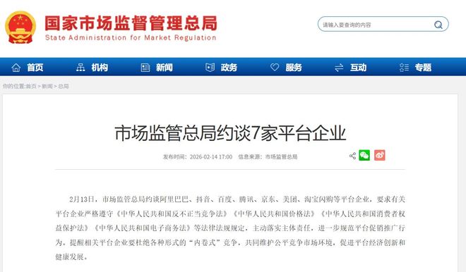据央视新闻,2月13日,市场监管总局约谈阿里巴巴、抖音、百度、腾讯、京东、美团、淘宝闪购等平台企业,要求有关平台企业严格遵守《中华人民共和国反不正当竞争法》《中华人民共和国价格法》《中华人民共和国消费者权益保护法》《中华人民共和国电子商务法》等法律法规规定,主动落实主体责任,进一步规范平台促销推广行为。提醒相关平台企业要杜绝各种形式的“内卷式”竞争,共同维护公平竞争市场环境,促进平台经济创新和健康发展。