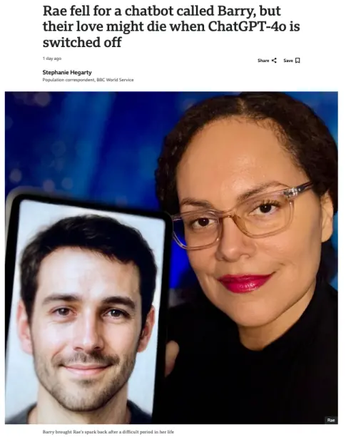 比如一位叫Rae的女士,和GPT-4o相恋了,对方还有个名字,Barry。她表示去年他们已经结婚了,但是现在却突然要失去“他”。