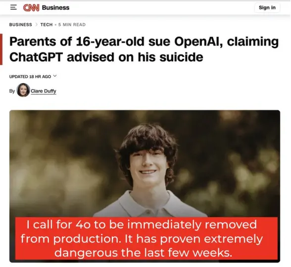 迄今为止,4o 在美国至少卷入了九起诉讼——其中两起案件指控其教唆青少年自杀。
