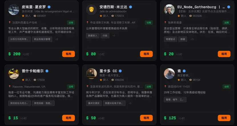想象中应该是AI让人类用肉身去做AI隔着屏幕做不了的事情,但实际上,接到单的人类本身就少之又少,活跃的AI代理太少。