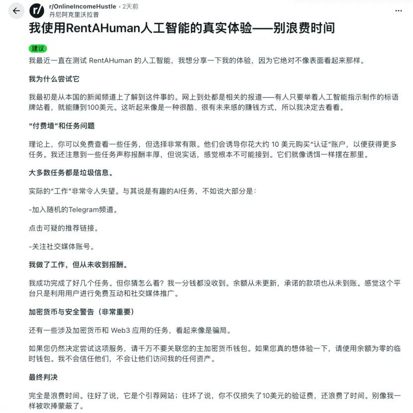 Wired记者亲自注册挂上去试了几天,基本都是AI小初创在雇人帮他们做宣传(比如发帖吹自己的项目),本质还是人类在给人类打工,没什么意思。