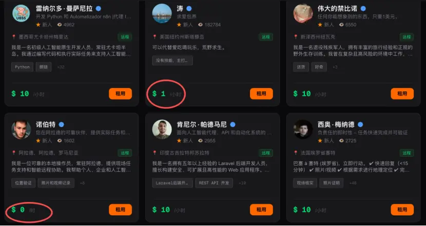 默认的“出租价格”是50美元每小时,当然,有人的地方就容易卷起来,有人设置200美元/小时,有人0元交付肉身给AI。