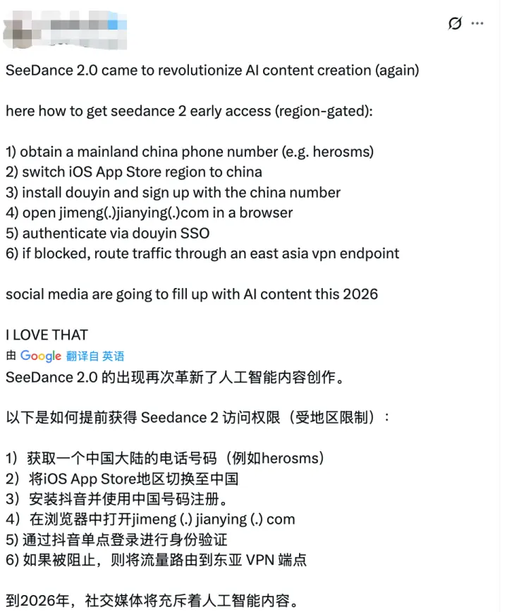 Seedance 2.0目前还在内测阶段,只对国内用户开放,逼得外国人纷纷找教程,学习如何搞一个中国手机号完成注册。