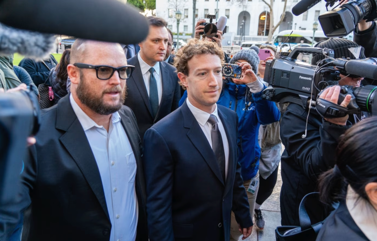 扎克伯格身着海军蓝西装并佩戴领带,在庭审进入第二周辩论时出庭作证。此次诉讼的焦点是包括Meta旗下脸书和Instagram在内的社交媒体服务被指控对用户构成的伤害。
