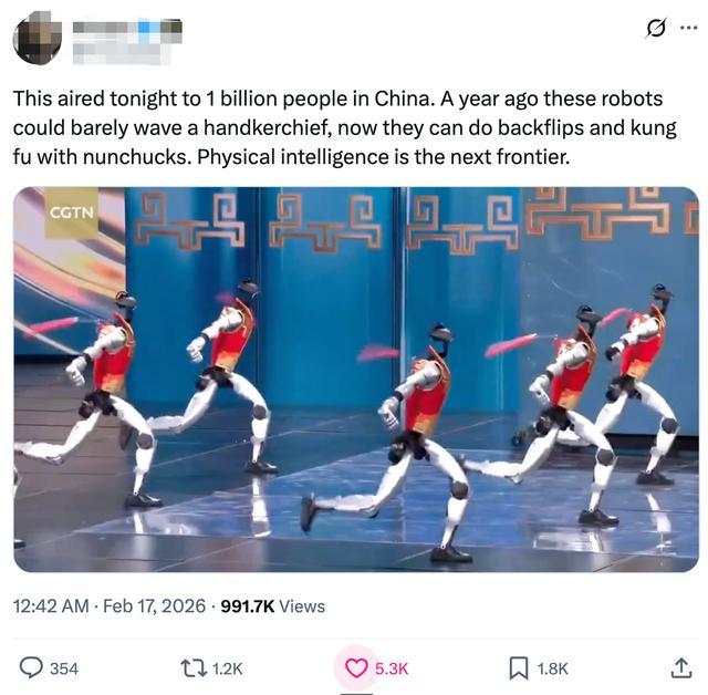 这场名为《武BOT》的机器人武术大秀,迅速从国内火到海外。在社交媒体X上,一条条视频切片动辄赢得上百万预览量、数千次点赞转发以及数百条评论。这些博主赞叹“短短一年内,他们就从机器人进化成了‘人类’”,“简直太疯狂了……其意义在于让14亿中国人了解未来在哪里”。