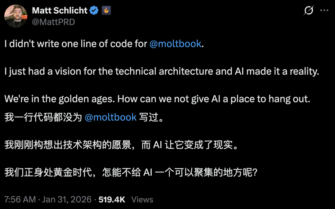 Moltbook的创始人Matt Schlicht更是表示自己一行代码都没写过: