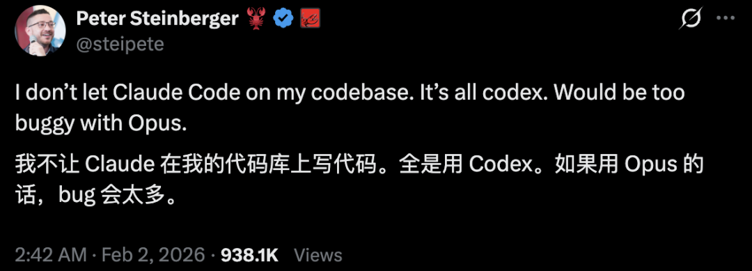 有意思的是,Steinberger信任的AI工具是OpenAI的Codex,他认为Claude的Opus模型bug太多,而Codex可以更好地驾驭大型代码库。