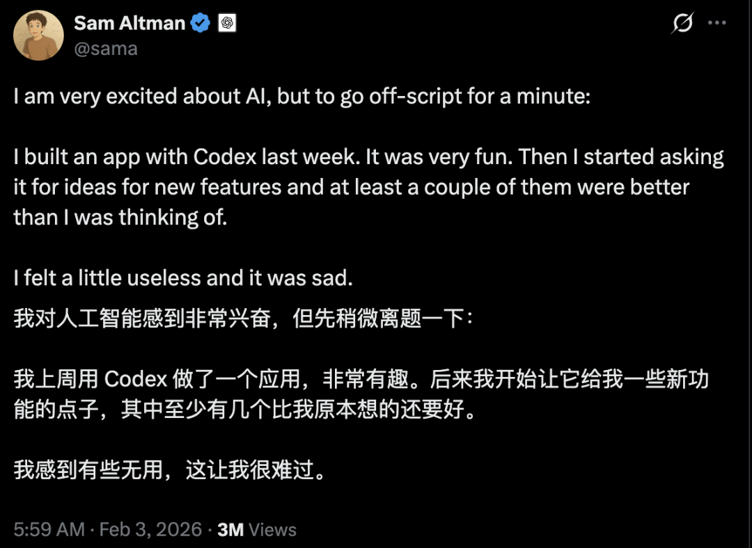近日,奥特曼也曝出自家的Codex太好用,“我感到有些无用,这让我很难过”。他还曝出接下来一个月会陆续推出一系列Codex相关的激动人心的产品。