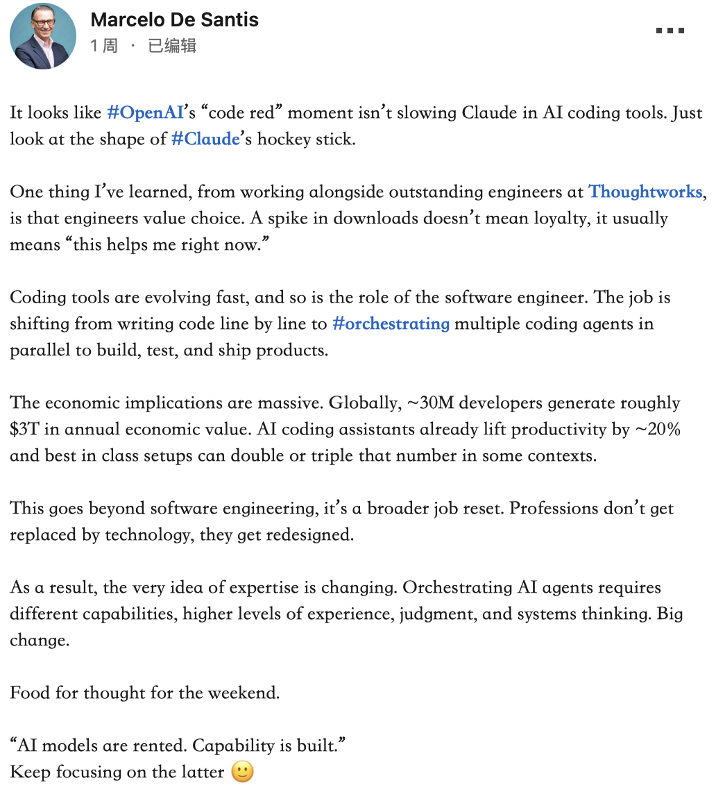 在Marcelo看来,软件工程正在经历一场从“逐行代码”到“并行编排智能体”的彻底重构,也将全球3000万开发者带到了一个十字路口。