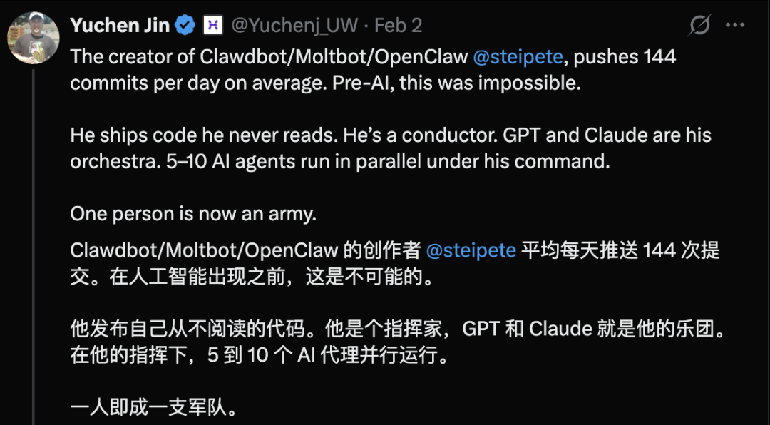 网友评价Steinberger是个指挥家,GPT和Claude就是他的乐团,“一人即成一支军队”。