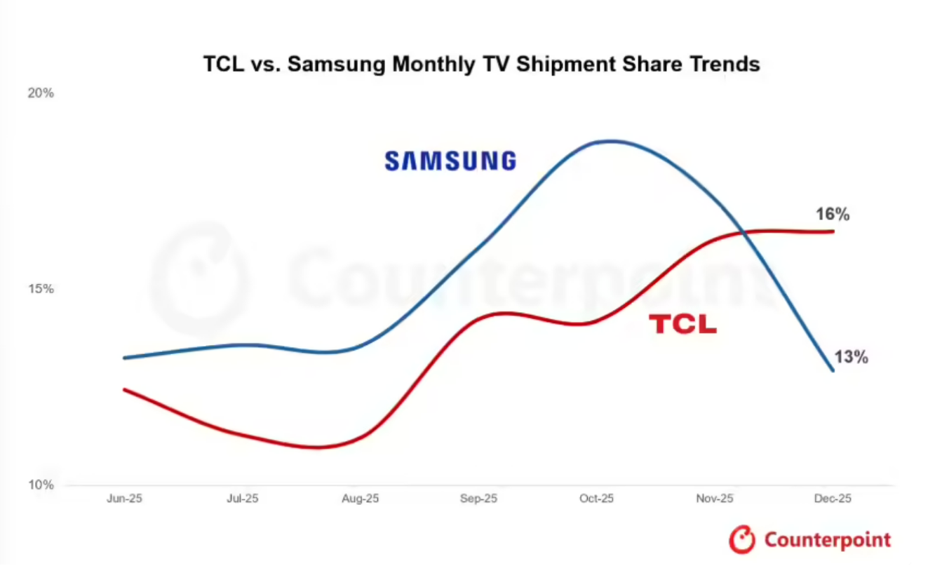 调研机构Counterpoint Research给出的最新报告显示,TCL超越三星,登顶2025年12月全球电视出货量榜首。报告显示,TCL当月(去年12月)出货量的增长,主要依靠亚太、中国、中东非地区的大幅攀升,这部分增量完全抵消了其在北美、西欧市场的小幅下滑,最终实现10%的同比增幅。