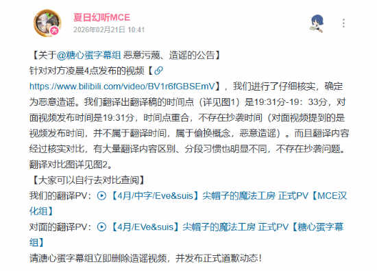 近日,国内两大汉化字幕组——糖心蛋字幕组与夏日幻听MCE之间的公开冲突引发关注。事件的导火索是糖心蛋字幕组此前发布的一则视频(现已下架),指控夏日幻听MCE在翻译《尖帽子的魔法工房》PV宣传片时存在抄袭行为。