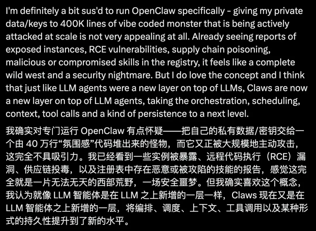 狂欢背后,OpenClaw正面临着严峻的安全考验。Karpathy在兴奋之余也坦言了自己的极度不安: