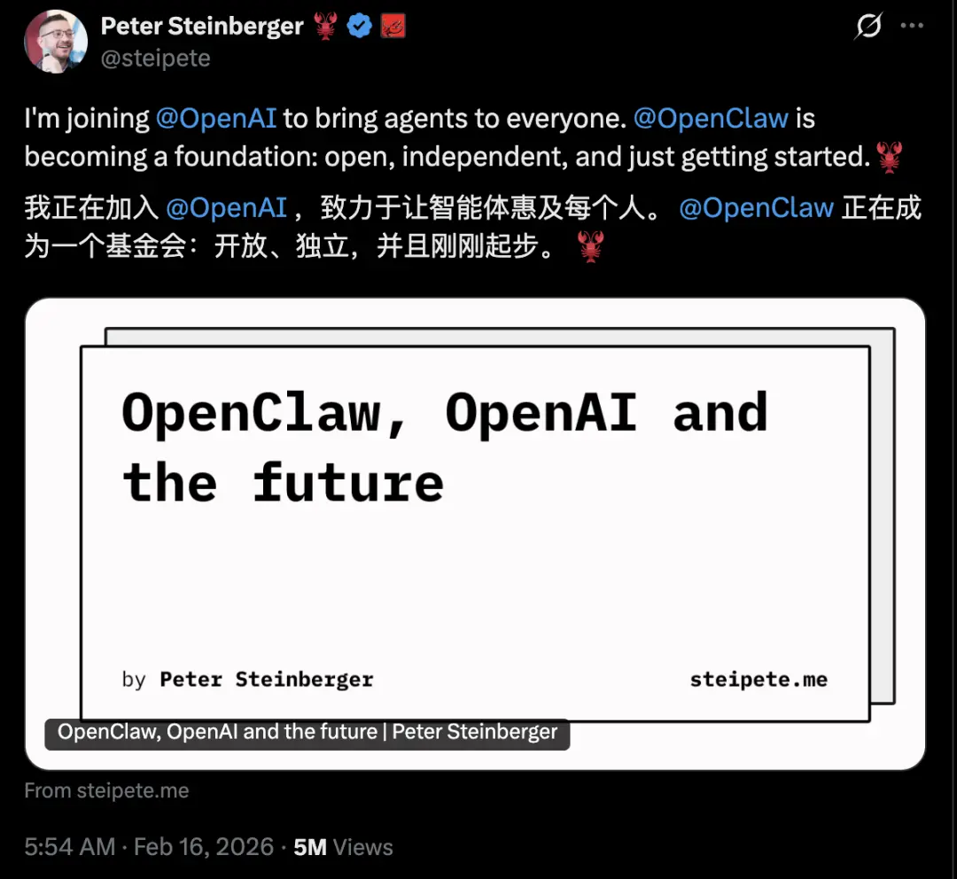 项目创始人Peter Steinberger在2月16日发帖宣布加入OpenAI负责个人智能体方向的开发,OpenClaw过渡到由OpenAI提供资金和技术支持的独立基金会。