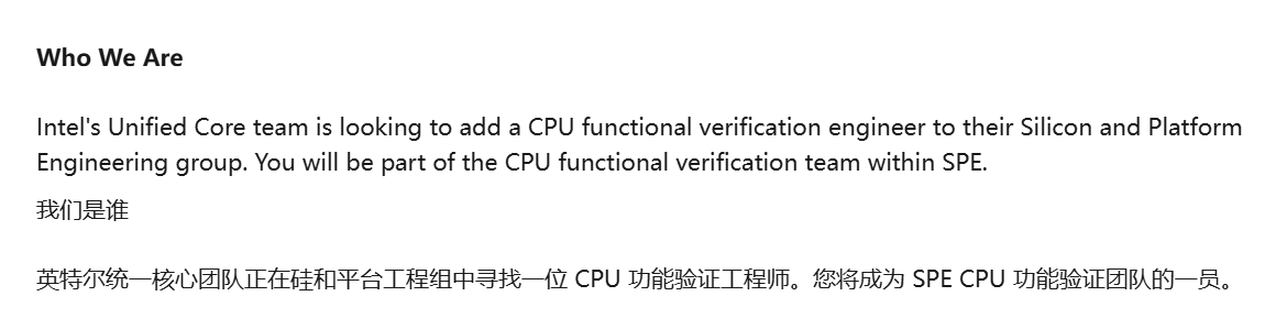 2021年发布的Alder Lake架构12代酷睿上,Intel正式在x86架构中引入了P性能核、E效能核两种架构,然而未来的CPU架构又要回归统一,不再区分P、E核心。从领英上的招聘页面来看,Intel招聘的高级CPU验证工程师内容中提到了统一核心团队(Unified Core team),招聘的这个工程师要求很高,待遇也非常好,年薪14-27万美元之间。