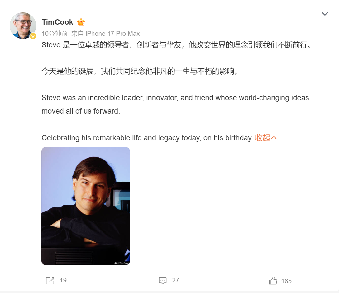 库克发文纪念乔布斯诞辰:一位卓越的领导者、创新者与挚友