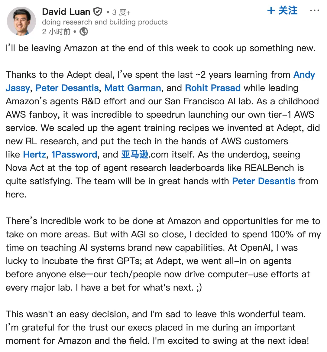 “亚马逊还有不可思议的工作要做,我也有机会去承担更多领域的工作。但鉴于AGI已近在咫尺,我决定将100%的时间投入到赋予AI系统全新能力上。”大卫·栾表示。