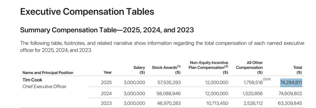 图:股东会上公布的库克2025年确认年薪和上一年几乎持平