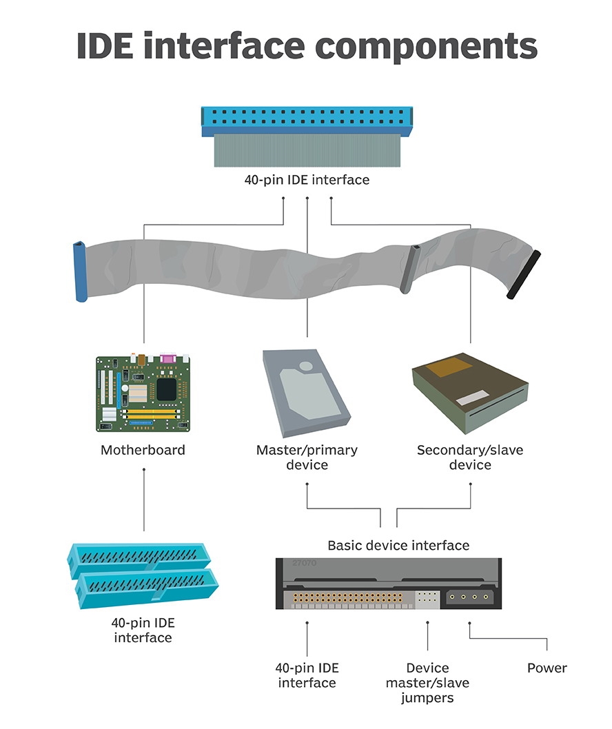 现在的机械硬盘接口都是SATA,但是在它之前你知道是什么吗?IDE全称Integrated Drive Electronics(集成驱动电子),也叫PATA(并行ATA),是一种长条形塑料接口,对应的数据线是40针的排线,搭配大四针供电接口和电源线,支持主从条线。