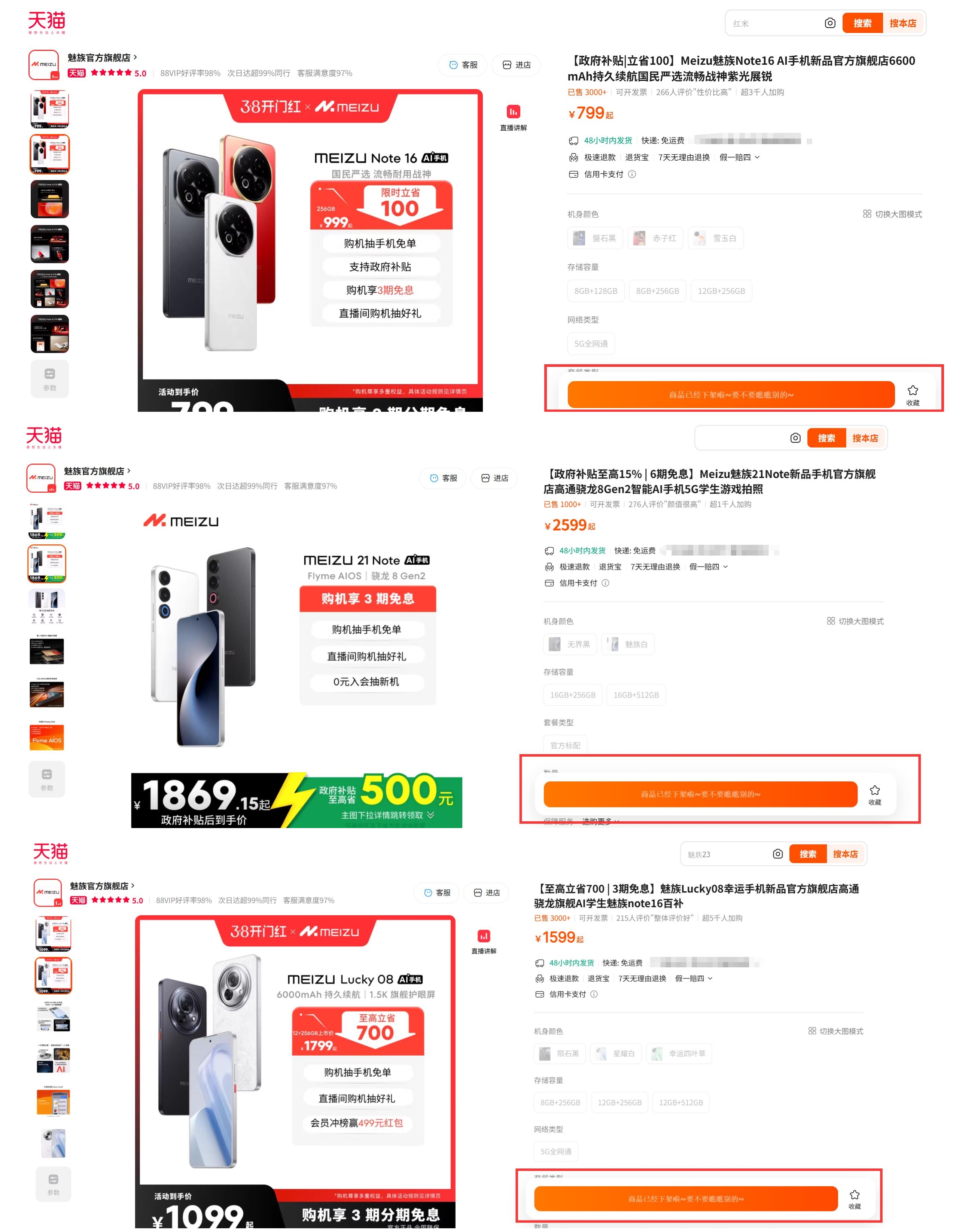 网友发现魅族天猫官方旗舰店的所有手机都已全部下架,仅剩部分PANDAER系列配件在销售。具体来看,不仅是魅族数字系列旗舰,连同定位千元市场的魅族Lucky 08、魅族Note 16系列也已悉数从天猫平台消失。
