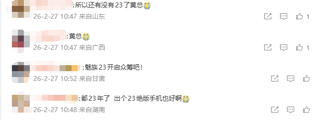 不少网友在黄质潘微博评论区留言称:“23发布再暂停啊”“魅族23开启众筹吧”“魅族还能重启手机业务吗?”