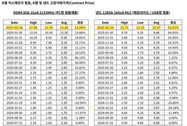 据市场研究机构DRAMeXchange最新消息,2月份通用PC DRAM产品(DDR4 8Gb 1Gx8)的平均固定交易价格为13美元,较上月的11.50美元上涨了 13.04%。