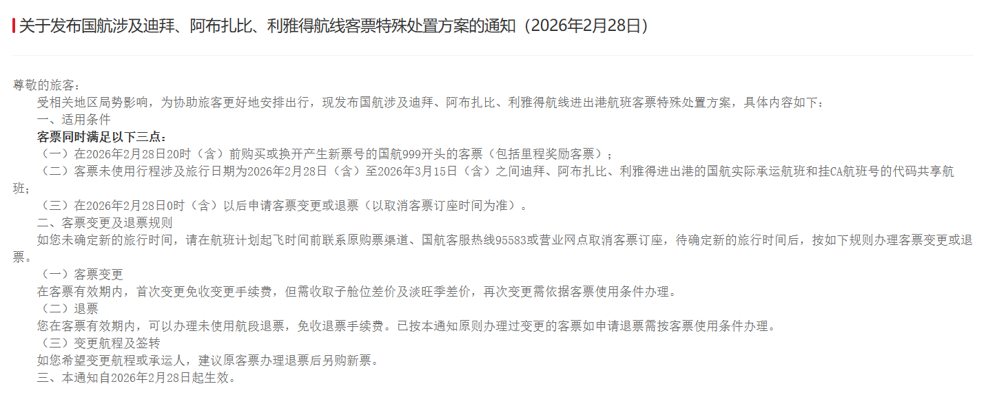 (二)客票未使用行程涉及旅行日期为 2026 年 2 月 28 日(含)至 2026 年 3 月 15 日(含)之间迪拜、阿布扎比、利雅得进出港的国航实际承运航班和挂 CA 航班号的代码共享航班;
