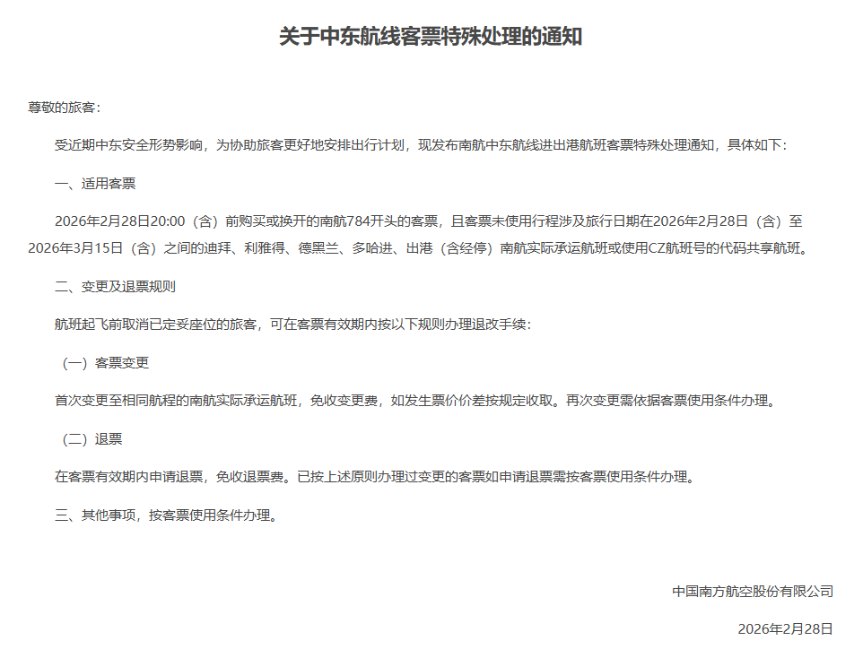 2026 年 2 月 28 日 20:00(含)前购买或换开的南航 784 开头的客票,且客票未使用行程涉及旅行日期在 2026 年 2 月 28 日(含)至 2026 年 3 月 15 日(含)之间的迪拜、利雅得、德黑兰、多哈进、出港(含经停)南航实际承运航班或使用 CZ 航班号的代码共享航班。