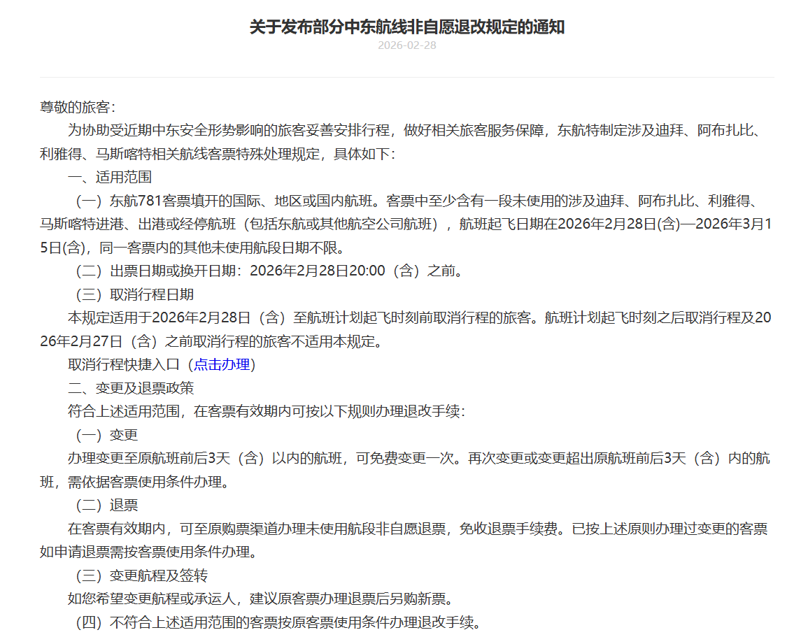 (一)东航 781 客票填开的国际、地区或国内航班。客票中至少含有一段未使用的涉及迪拜、阿布扎比、利雅得、马斯喀特进港、出港或经停航班(包括东航或其他航空公司航班),航班起飞日期在 2026 年 2 月 28 日 (含)—2026 年 3 月 15 日 (含),同一客票内的其他未使用航段日期不限。