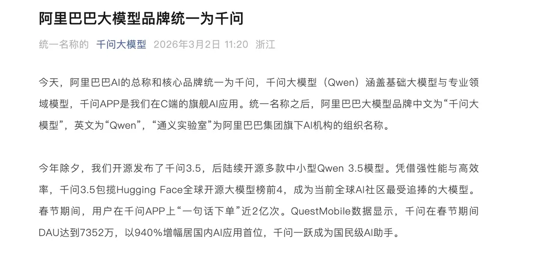 3月2日,千问大模型官方宣布,阿里巴巴正式将旗下AI业务总称及核心品牌统一整合为“千问”(英文名Qwen)。此次业务梳理后,千问大模型将作为涵盖基础模型与专业领域模型的统一名称,千问APP被确立为面向C端的旗舰应用,而通义实验室则明确为阿里集团旗下AI机构的组织架构名称。