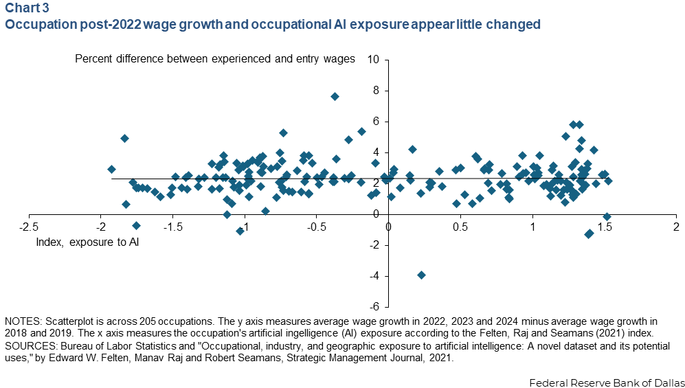 尽管AI暴露行业就业落后,但工资增长超过全国平均水平。自2022年秋季以来,全国名义周平均工资上涨7.5%,计算机系统设计行业涨幅达16.7%,AI暴露前10%行业工资增长8.5%。对205个职业的分析显示,AI暴露度与2022年后工资增长无直接关系。