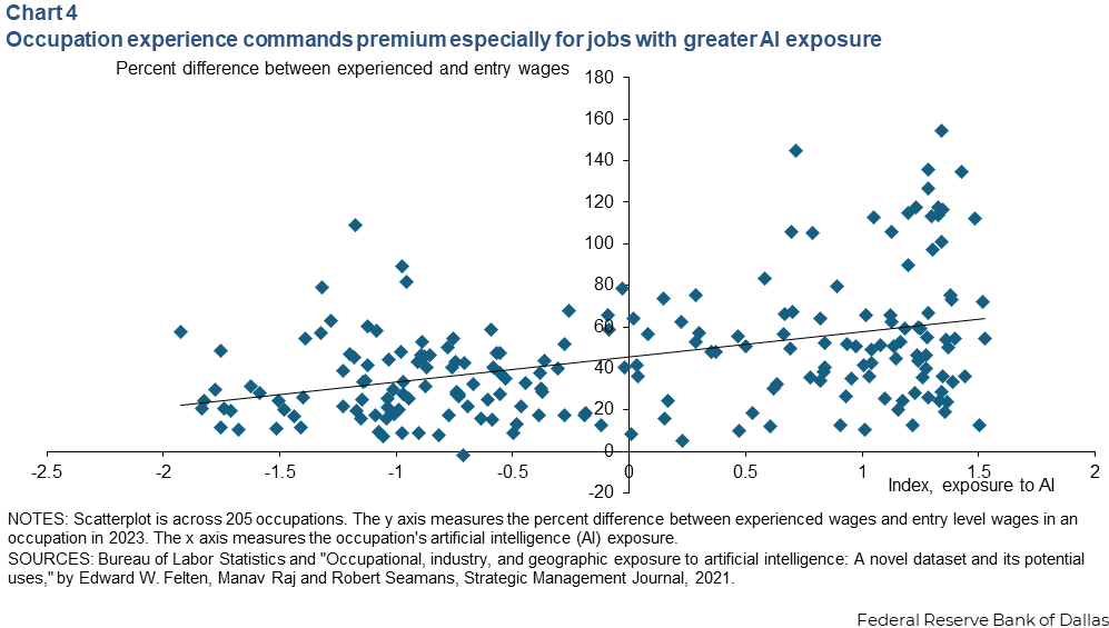 为评估职业对可编码或隐性知识的需求,Davis使用美国劳工统计局数据计算经验溢价(资深与初级工资差)。对205个职业分析显示,经验溢价与AI暴露正相关,高暴露职业通常经验溢价更高,中位数为40%,律师等达100%以上。回归分析显示,对于经验溢价中位数的职业,AI暴露对工资增长影响微乎其微(-0.05个百分点)。低经验溢价职业(如快餐厨师)AI暴露导致工资增长下降0.28个百分点;高经验溢价职业则上涨0.2个百分点,AI取代初级但补充资深工人。