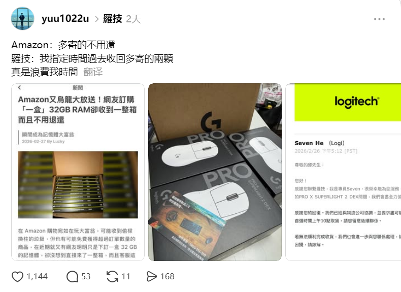 之前我们见过不少美国用户分享下单一件却收到数倍商品,且客服表示无需退还的经历,那么这种事情发生在其他地方会怎样呢,结局可能会完全不同。据报道,台湾的邸先生分享了自己申请罗技鼠标售后的经历,他在去年11月购入罗技SuperLight 2 DEX鼠标,使用三个月后滚轮出现回滚故障,导致在进行《无畏契约》等射击游戏时频繁乱切枪。
