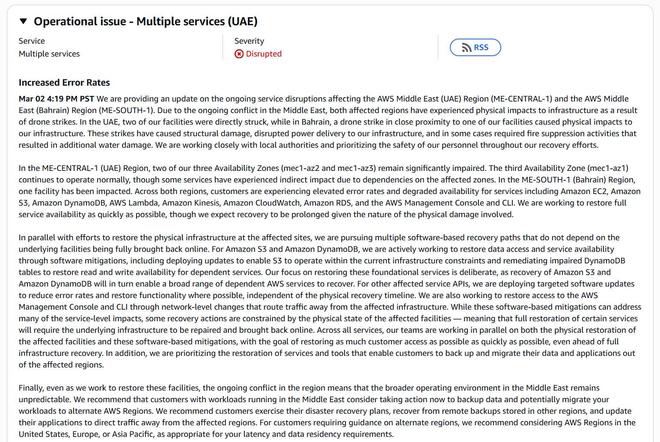 AWS表示:“在阿联酋,我们的两处设施被直接击中。而在巴林,一次靠近我们设施的无人机袭击对我们的基础设施造成了物理损害。这些袭击造成了结构性破坏,导致基础设施的电力供应中断,并在某些情况下需要进行灭火作业,这又造成了额外的水损害。”