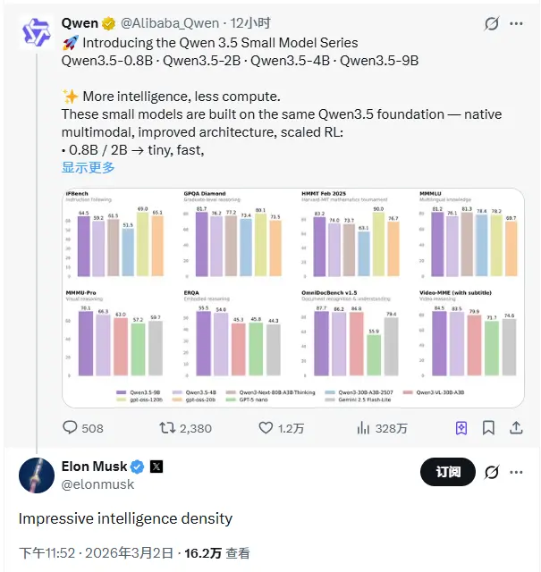 马斯克称赞阿里巴巴Qwen模型:智能密度令人印象深刻