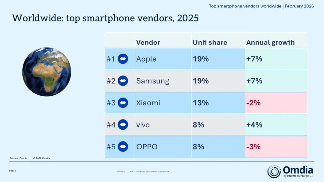 市场研究机构Omdia最新报告显示,2025年全球智能手机市场迎来温和复苏,全年出货量达12.5亿部,同比增长2%,创下2021年以来年度出货量新高。区域表现呈现分化,除大中华区外,全球主要市场出货量均同比增长,中国大陆市场受补贴政策激励效果未达预期影响,出货量小幅下滑。