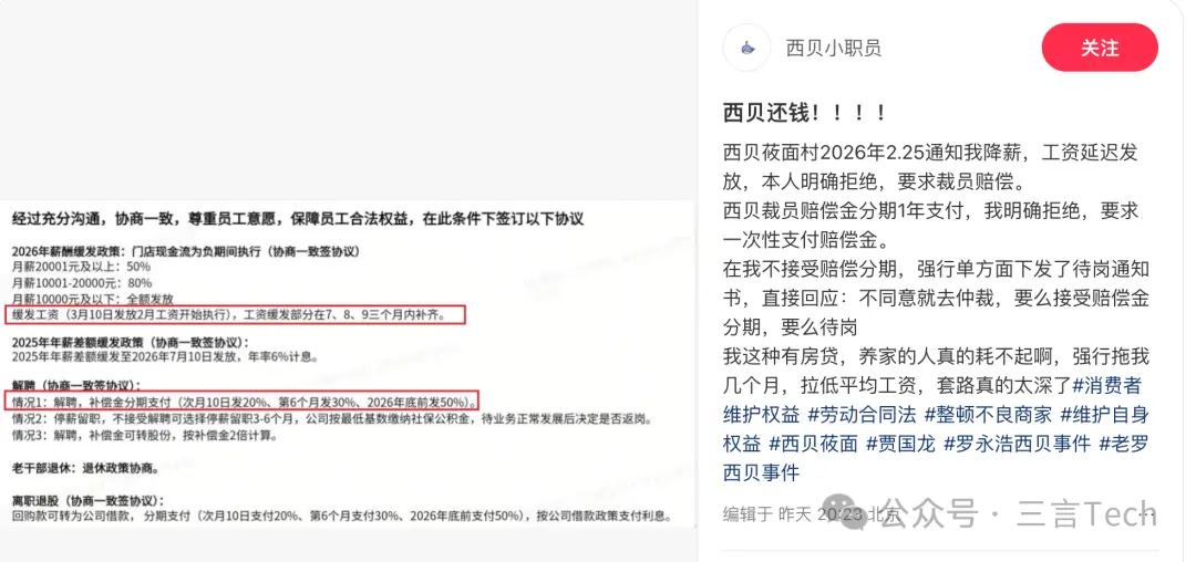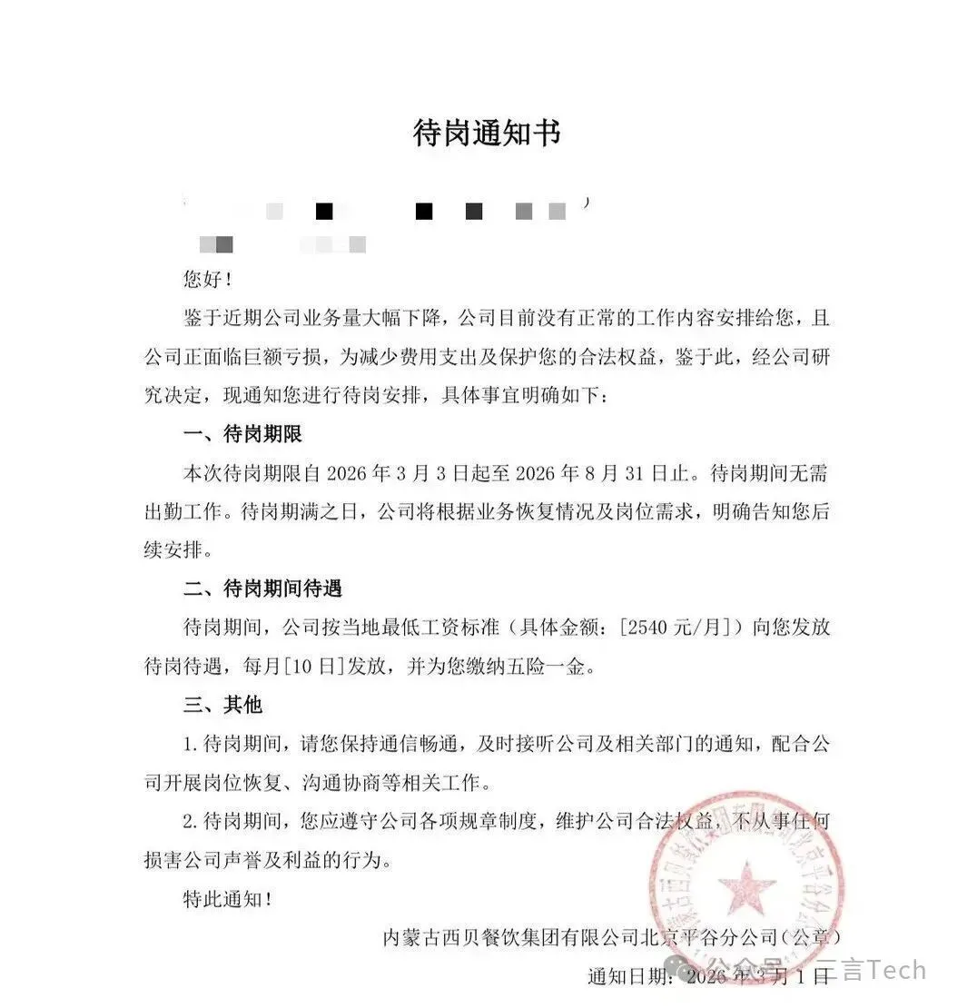 3月3日,有自称西贝北京员工的网友称,2月25接到降薪通知,工资延迟发放,在明确拒绝后,公司要求裁员赔偿。但裁员赔偿金要分期1年支付,员工再次拒绝,要求一次性支付赔偿金,最后公司下发了待岗通知书,并且表示“不同意就去仲裁,要么接受赔偿金分期,要么待岗” 。