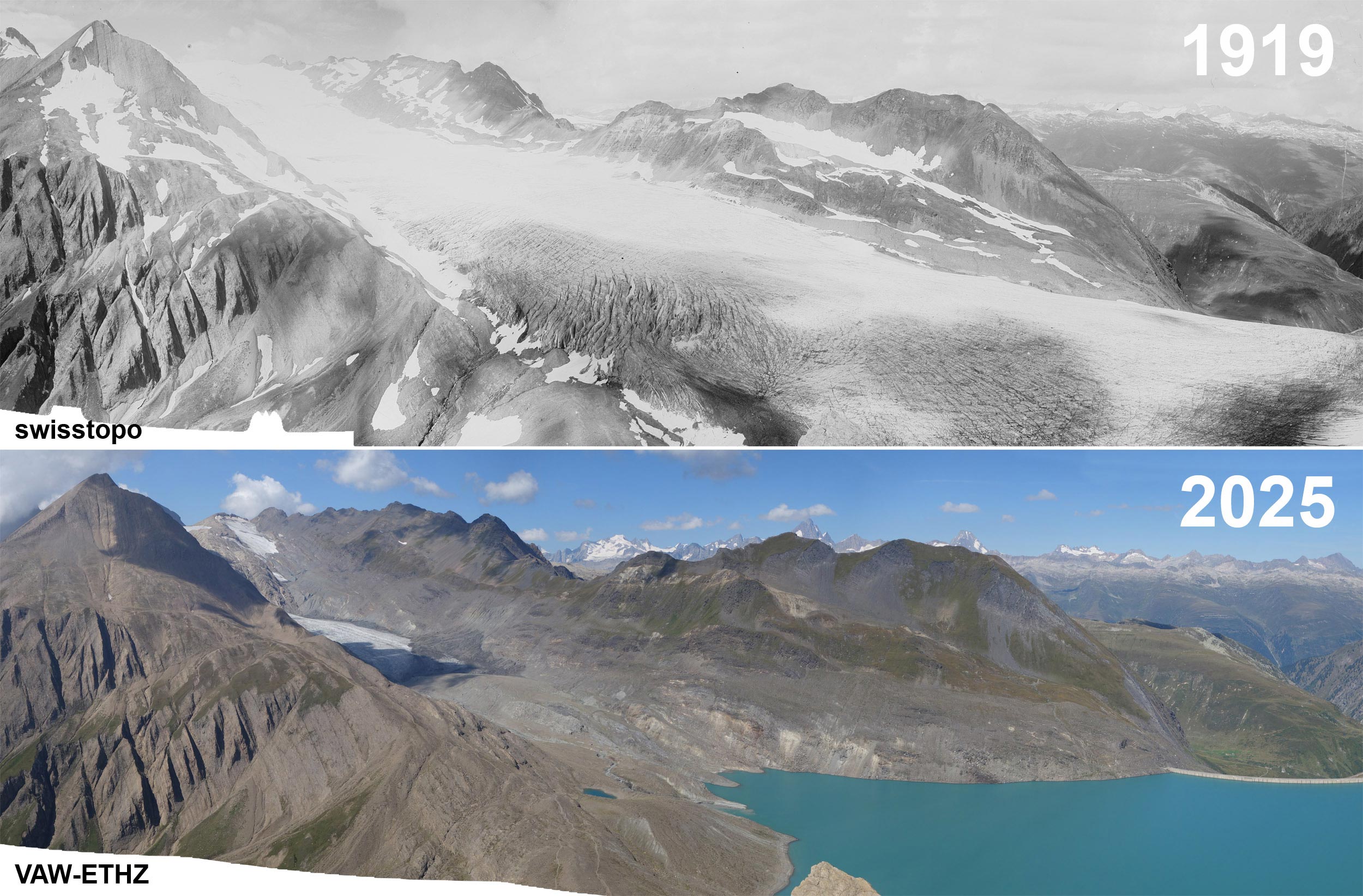 长期观测还显示,过去十年已是瑞士有记录以来冰川退缩最快的十年。 历史对比影像显示,瓦莱州 Gries 冰川从 1919 年至 2025 年的范围收缩极为显著,大面积冰体不复存在。 研究人员强调,如果全球气候变暖趋势持续,许多中小型冰川将在未来几十年内完全消失,阿尔卑斯山传统雪线高度和地貌格局也将随之发生深远变化。