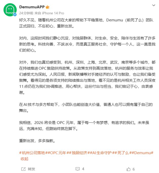 3月5日消息,曾因App“死了么”爆火又下架而引发广泛关注的Demumu团队(前“死了么”)今日正式官宣回归。团队表示:“好久不见,随着杭州公司在大家的帮助下平稳落地,我们不忘初心,重新出发。”