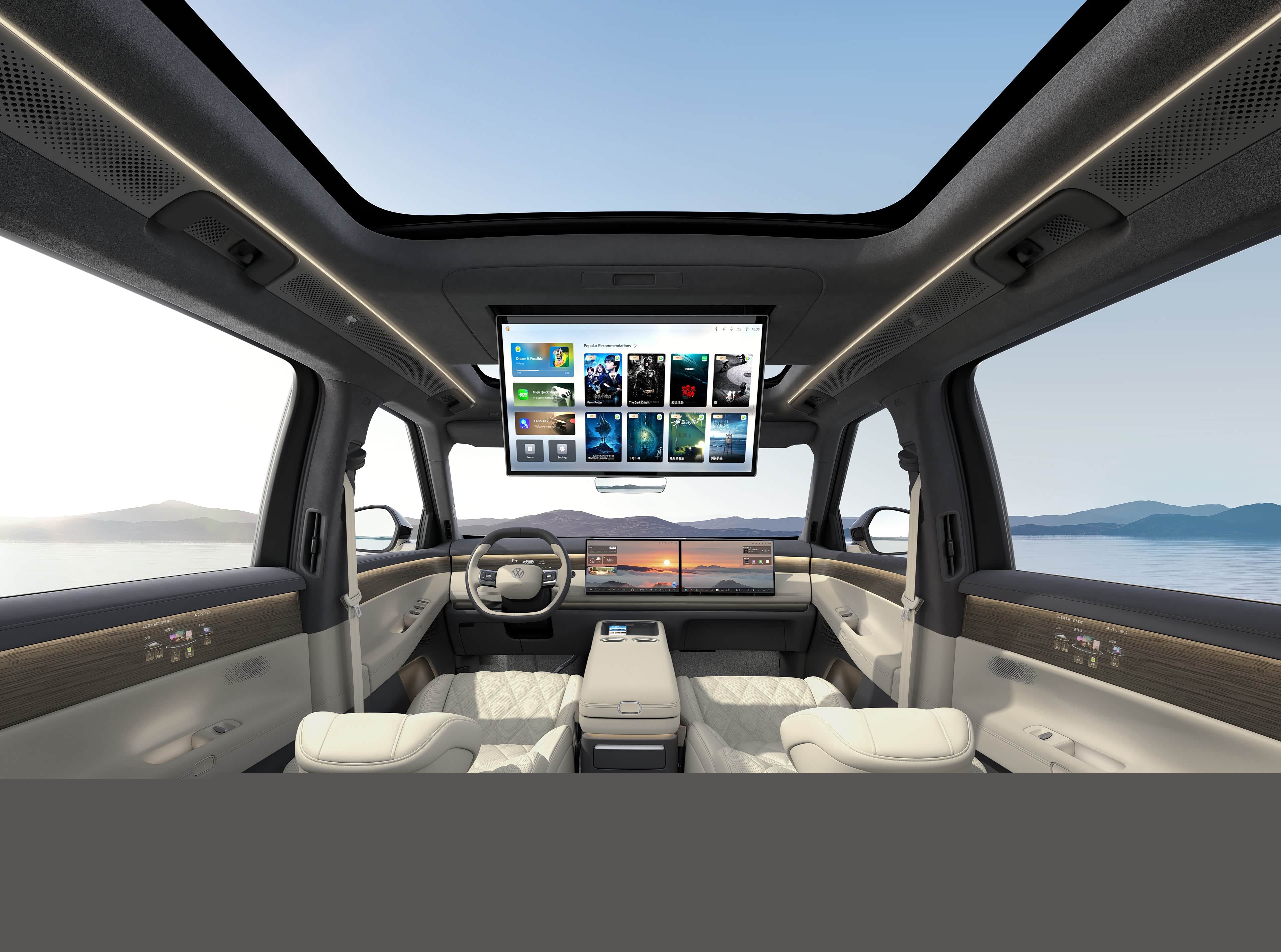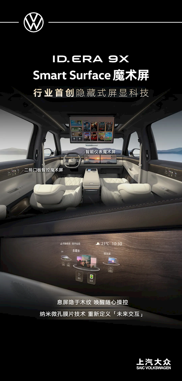 亮点科技上,ID. ERA 9X首次搭载行业领先的Smart Surface魔术屏技术,其采用微孔膜片工艺,在屏幕关闭时与内饰材质完美融合,实现“只见材质不见屏幕”的隐形式美感;点亮后画面清晰通透,无纹理干扰。