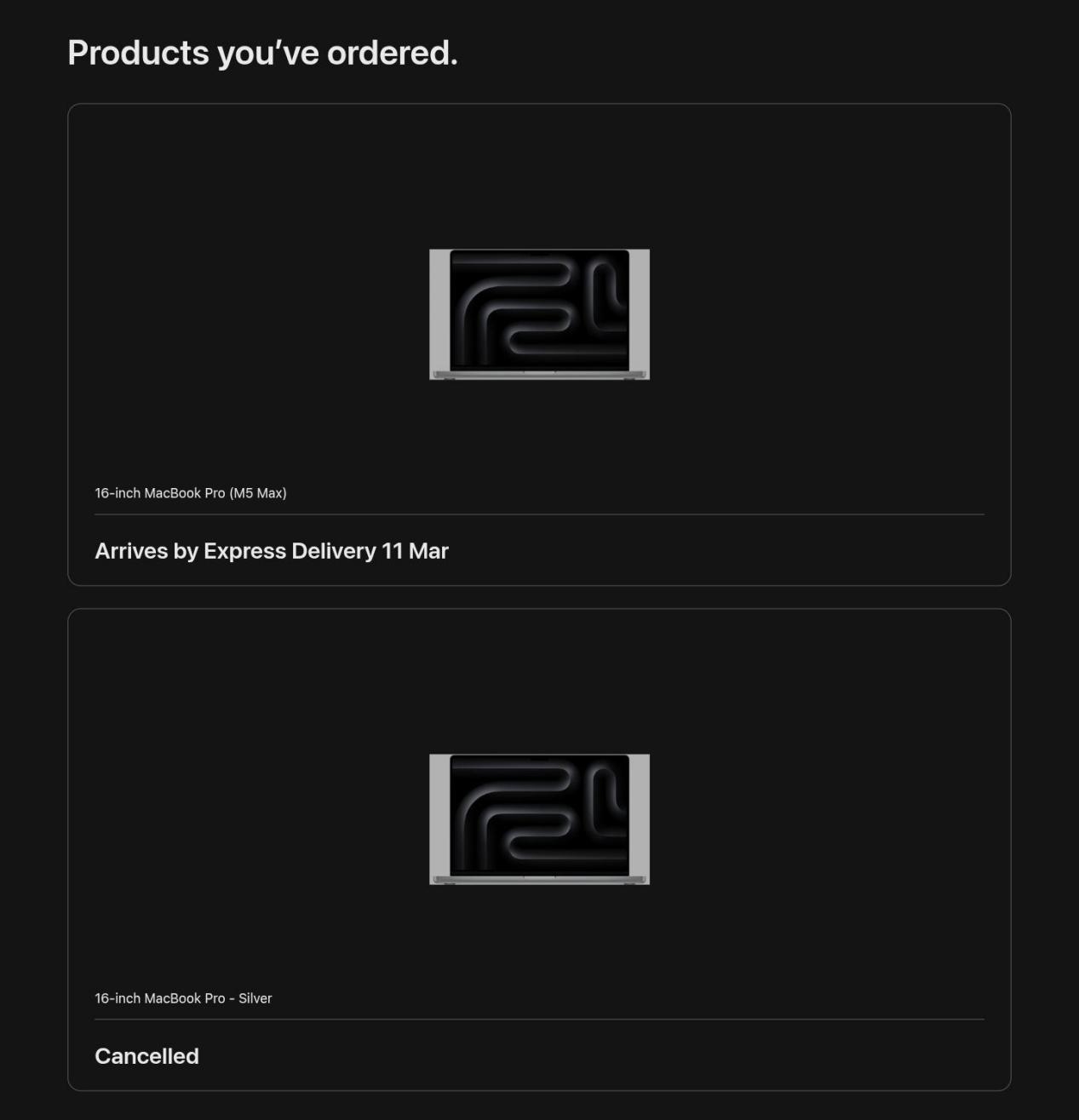 o2b也分享了自己的经历,他在二月中旬下单了48GB内存的M4 Max MacBook Pro,原本预计3月3日-10日送达,没想到订单突然被取消并换成了M5 Max版本,价格维持原价,发货日期也顺延至新机开售的3月11日。
