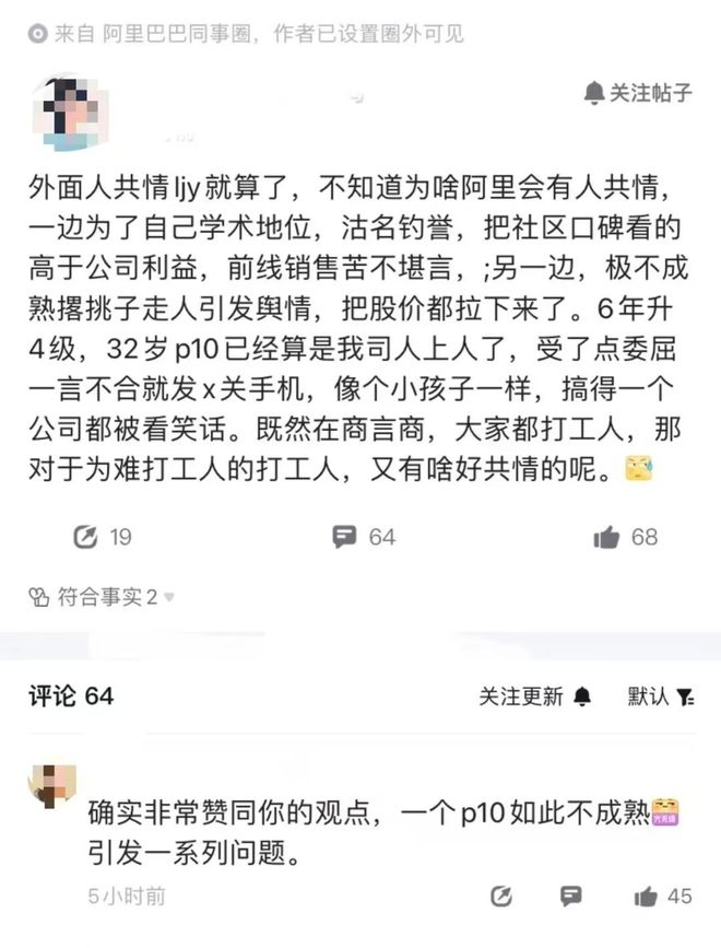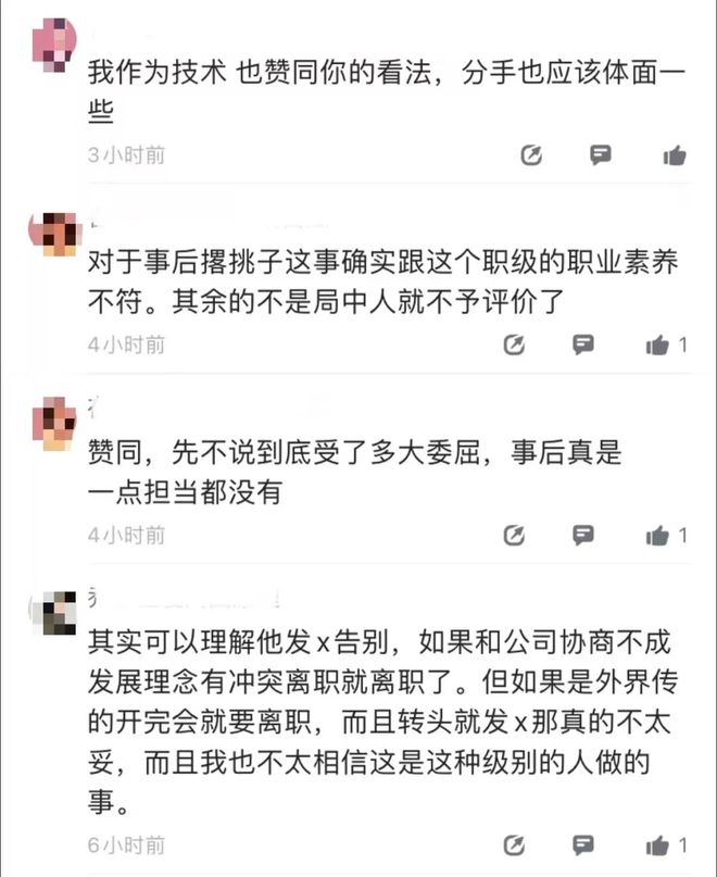 对此,该贴下有人表示赞同,认为“一个p10如此不成熟引发一系列问题”;也有人认为,认为“分手也应该体面一些”,还有评论称“对于事后撂挑子这事确实跟这个职级的职业素养不符”。