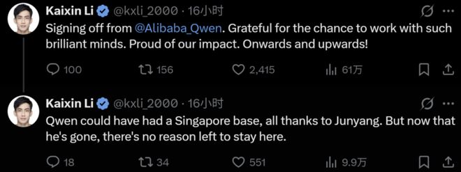 Kaixin Li在X上提到,在林俊旸的推动下,Qwen原本可能在新加坡建立技术据点,但随着林俊旸的离开,自己“没有了留下来的理由”。