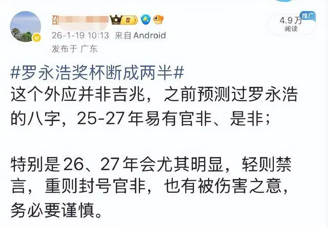 他说,奖杯断裂是不祥之兆,正好印证了他之前的预测,罗永浩未来两年容易有官非、是非,2026、2027年尤其明显,轻则禁言,重则封号,甚至还有“被伤害”之意,让罗永浩务必谨慎。