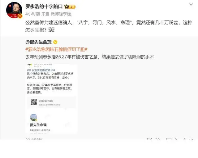 3月7日,罗永浩直接发文硬核回怼:“公然宣传封建迷信骗人,‘八字,奇门,风水,命理’,竟然还有几十万粉丝,这种怎么举报?”