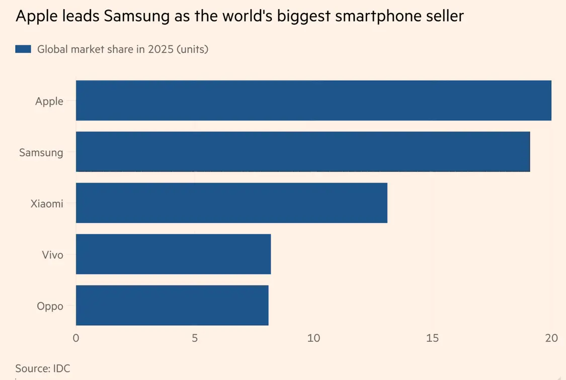 IDC本周警告称,一场“海啸般的冲击”正在袭击市场,将逆转“长达十年的消费者能够以更低价格买到配置更高智能手机的趋势”。去年,苹果选择不对新款iPhone 17系列进行涨价,这出乎了一些分析师的预料。新手机的销售帮助苹果实现了创纪录的假日季度业绩。